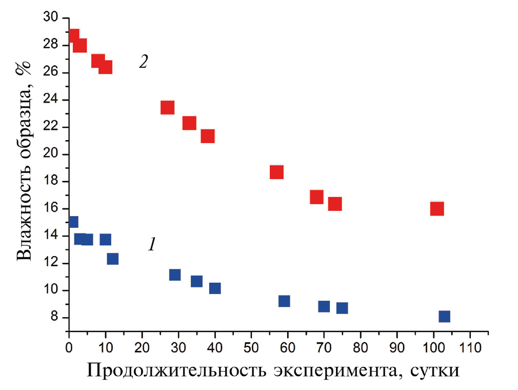 Необходимость жидкой воды для перестройки структуры гелей подтверждается и другими экспериментальными данными. В качестве примера приведены результаты, полученные нами для чернозема и дерново-подзолистой почвы (рис. 4). В эксикаторе над чистой водой почвенные образцы влажностью 0.7–0.8 НВ теряют воду через паровую фазу. В то же время при контакте этих образцов с жидкой водой они увлажняются.