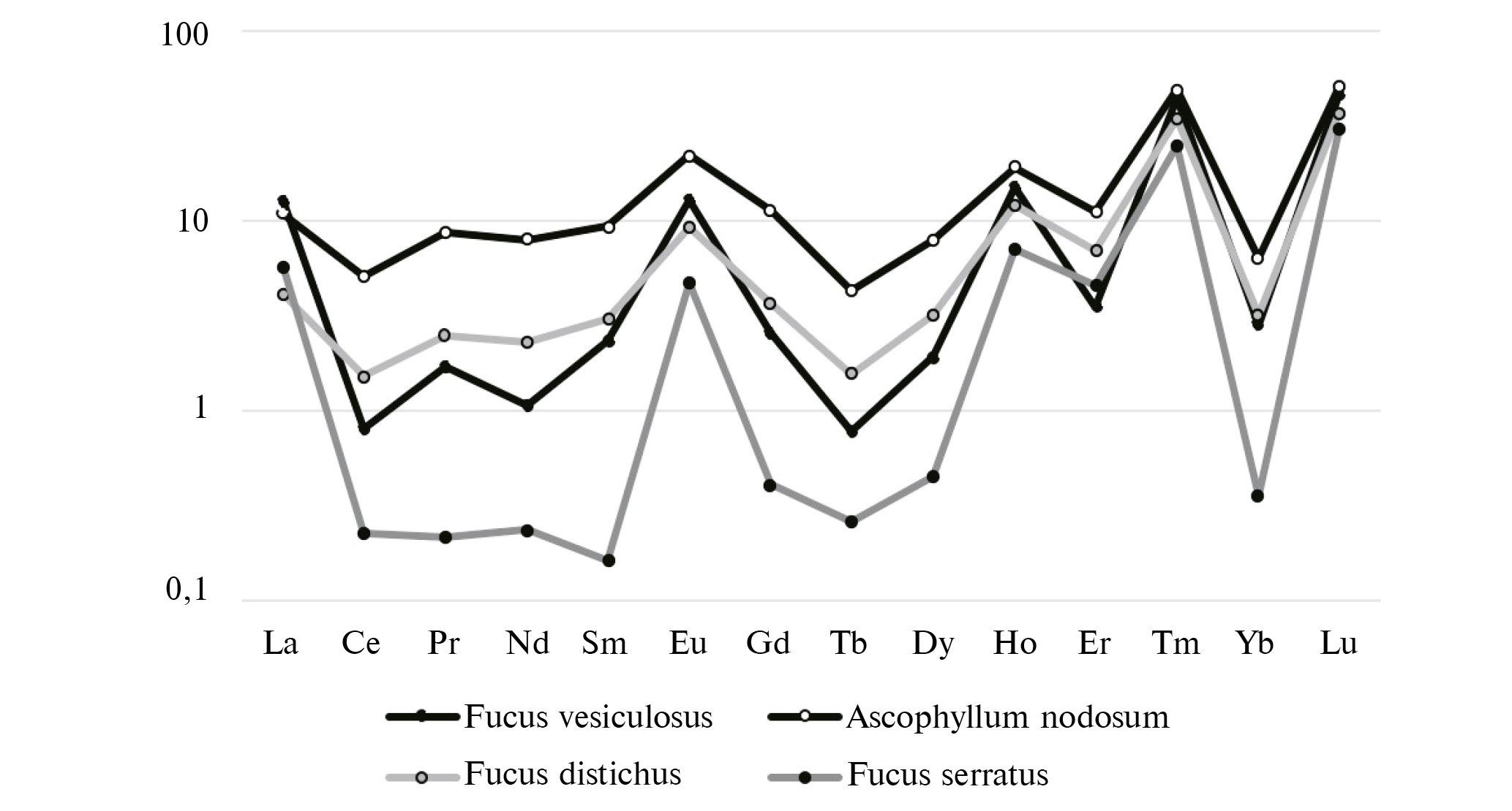 В южных морях среди макрофитов Cystoseira crinita, C. barbata, Dictyota dichotoma, Eclonia stoloniefera, Sargassum, hemiphyllum, S. honeri, Undaria pinnatifida, Eclonia cava, Adenocystis utricularis Colpomenia sinuosa обнаружены содержания РЗЭ на 2–3 порядка превышающие значения для фукусовых cеверных морей [13–17]. Такие различия могут определяться особенностями видов и (или) более высокими температурами воды.