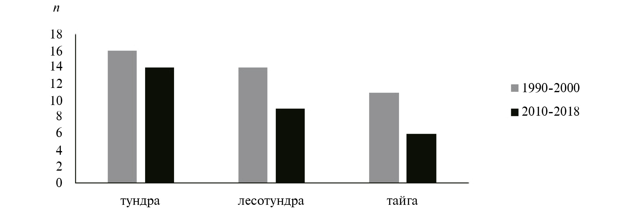 Рис. 3. Количество озер (n) с концентрацией Ptot < 10 мкгР/л в тундре, лесотундре и тайге в различные периоды: 1990–2000 и 2010–2018.