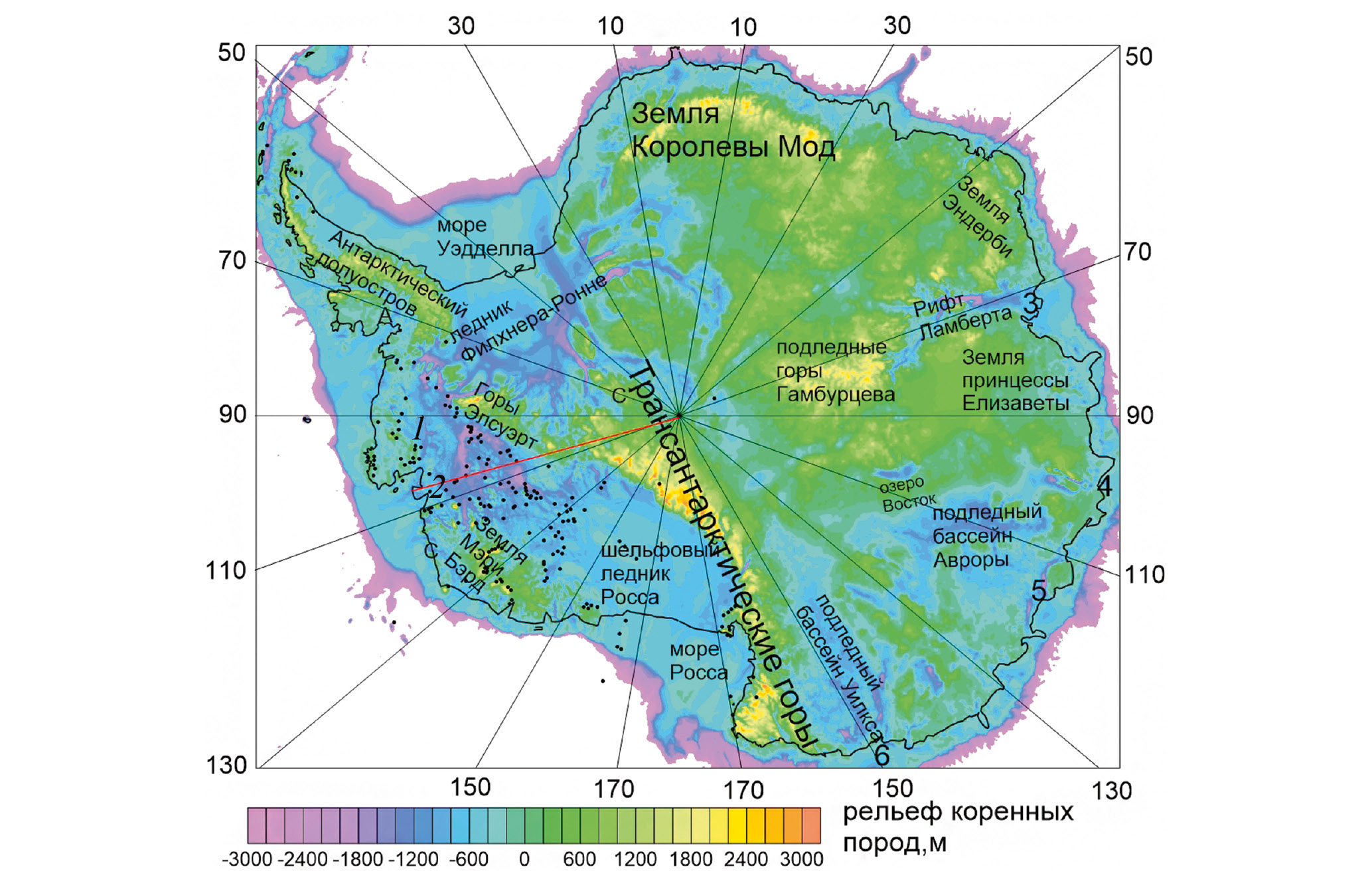 Рис. 1. Рельеф коренных пород Антарктиды по модели BEDMACHINE [5]. Красная линия – профиль от Южного Полюса до ледника Туэйтса. Вулканы отмечены черными точками. Цифрами отмечены быстродвижущиеся ледники: 1 – Пайн-Айленд; 2 – Туэйтс; 3 – Амери; 4 – Скотт и Денмен; 5 – Вендерфорт и Тоттен; 6 – Уилкса.