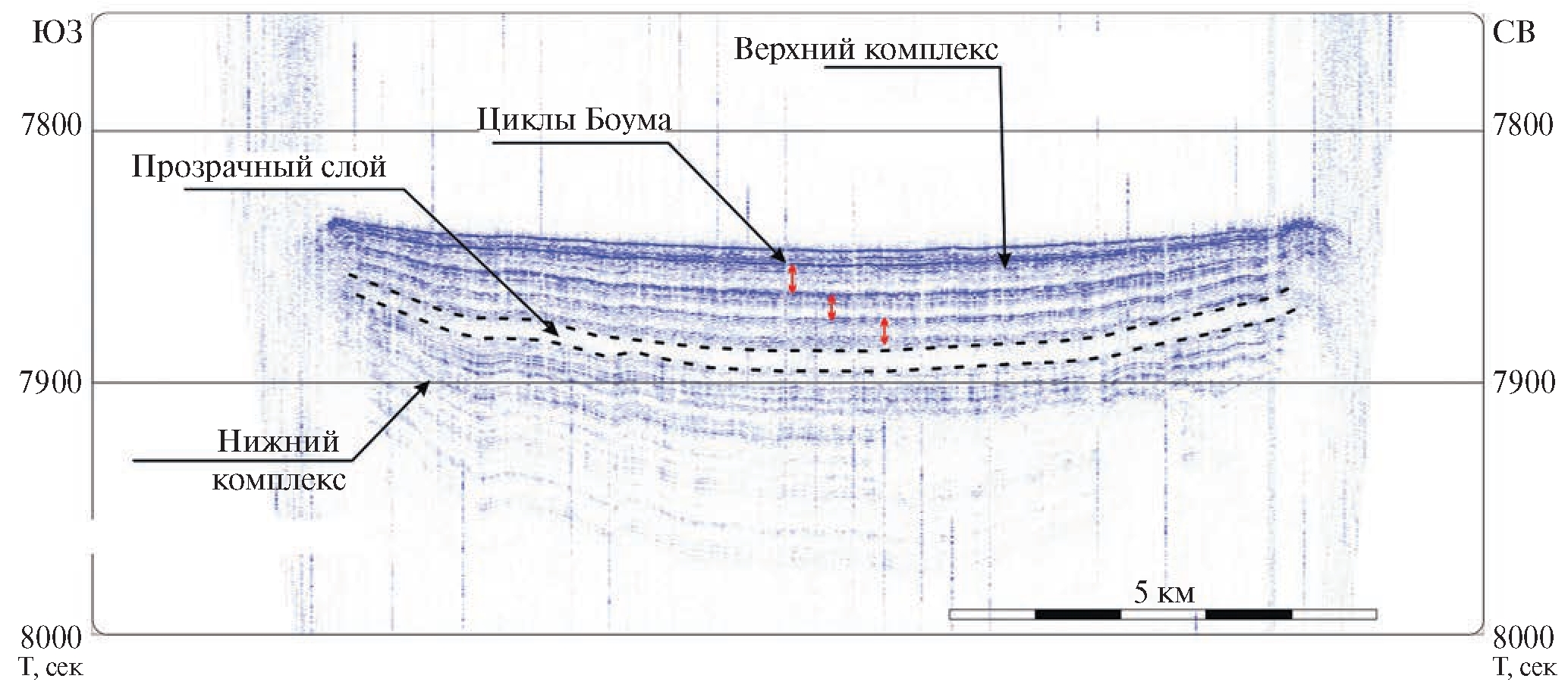 Рис. 3. Разрез верхней части осадочного чехла во впадине Пик.