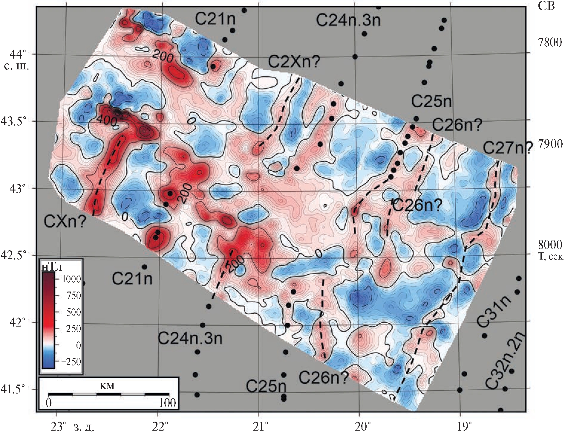 Магнитные аномалии полигона неоднородны по амплитуде и простиранию. Они представлены как линейными среднеамплитудными (до 400 нТл) аномалиями обеих знаков север-северо-восточного и отчасти – северо-западного простирания, наблюдающимися в основном в северной части полигона, так и интенсивными (до 1200 нТл) изолированными аномалиями также обоих знаков, приуроченными к отдельным хребтам и подводным горам (рис. 4). Наблюдаемые линейные магнитные аномалии к северу от трога Кинг и впадины Фрин хорошо согласуются с выделенными ранее по результатам многочисленных исследований эталонными аномалиями С21n, C24n.3n и C25n, положение которых показано на рис. 4, с возрастом 45.4, 53.3 и 56.6 млн лет соответственно [16].