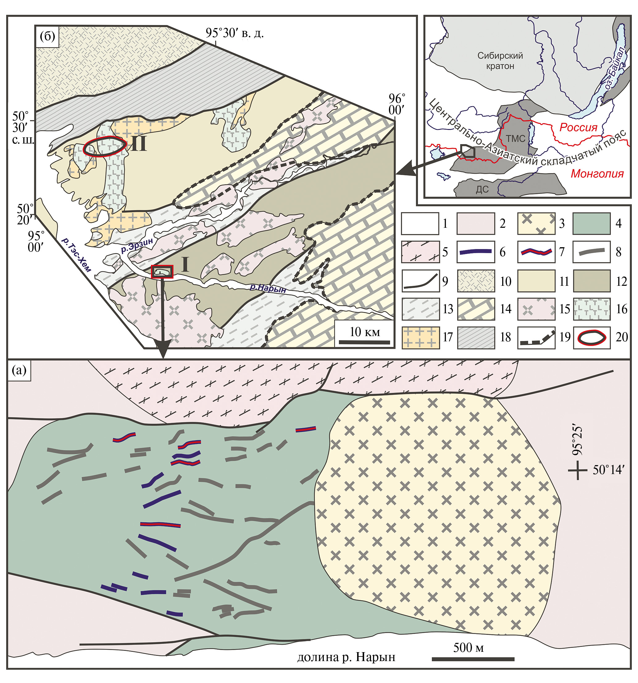 Рис. 1. Схема строения участка распространения даек Нарынского комплекса (а) и положение этого комплекса в геологических структурах юго-восточной Тувы (б) по [8] с упрощениями. Условные к рис. (а): 1 – кайнозойские образования, 2 – метаморфические комплексы чартысской серии (PR2); 3 – нефелиновые сиениты (С3?), 4 – габброиды (О2?), 5 – гранито-гнейсы эрзинского комплекса; 6–8 – дайки Нарынского комплекса: 6 – основного состава, 7 – комбинированные, 8 – не детализированные по составу; 9 – разломы. Условные к рис. (б): 10 – комплексы Таннуольской островной дуги, 11–13 – метаморфические комплексы Тувино-Монгольского супертеррейна: 11 – мугурский, 12 – нижнеэрзинский, 13 – эрзинский; 14 – карбонатно‐терригенный чехол; 15–17 – магматические комплексы: 15 – баянкольский габбро-граносиенит-гранитный, 16 – башкымугурский габбро-монцодиоритовый, 17 – башкымугурский гранит-лейкогранитный; 18 – Агардагский сутурный шов, 19 – границы тектонических покровов, 20 – районы развития дайковых комплексов (I – Нарынский, II – Агардакский). На врезке: ТМС – Тувино-Монгольский супертеррейн, ДС – Дзабханский супертеррейн.