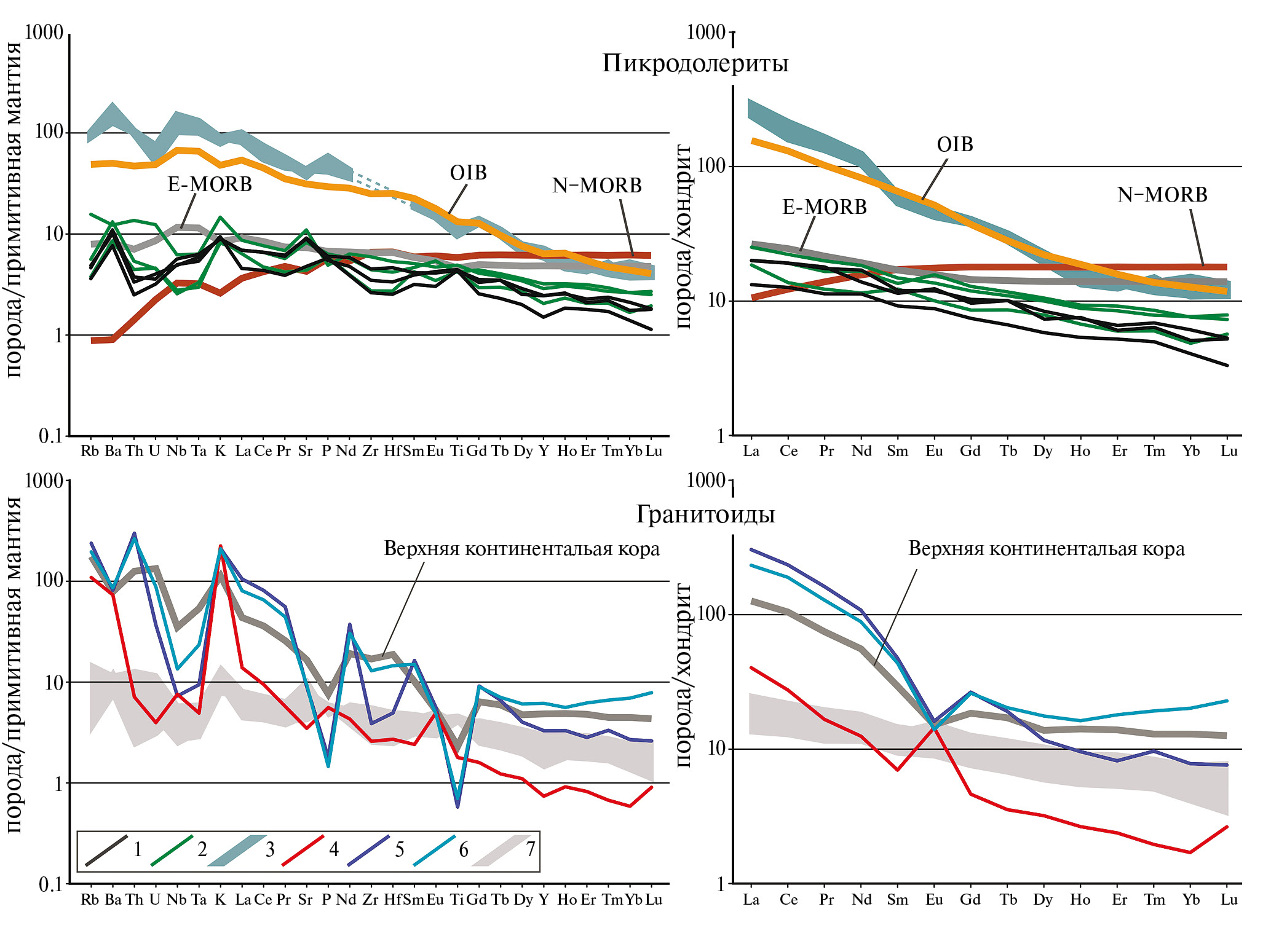 Распределение редких элементов в пикродолеритах приведено на рис. 4. Содержание несовместимых элементов в породах в целом ниже, чем в Е-MORB. По сравнению с N-MORB они обогащены Rb, Ba, Th, U и лёгкими редкоземельными элементами (РЗЭ), но обеднены средними и тяжёлыми РЗЭ. В спектрах распределения микроэлементов отмечается небольшой дефицит Zr и Hf и положительная аномалия Ba. В целом геохимические характеристики пикродолеритов простых и комбинированных даек являются близкими, что позволяет связать их с общим магматическим процессом. Различия между пикродолеритами простых и комбинированных даек отражены в появлении Nb‒Ta-минимума и повышенных концентрациях остальных микроэлементов в последних. Распределение РЗЭ в пикродолеритах обоих типов даек слабо фракционированное ((La/Yb)n 2.6–3.9), при этом по содержанию тяжёлых и средних РЗЭ пикродолериты обеднены относительно базальтов срединно-океанических хребтов.