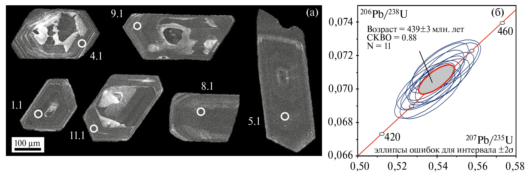 Как было показано, наблюдаемые соотношения между пикродолеритами и гранитоидами в комбинированных дайках свидетельствуют об одновременном их формировании. Это позволило определить возраст становления даек по циркону из гранитов комбинированной дайки. Циркон из лейкогранита ЧЖ-5/14 характеризуется сложным внутренним строением с отчётливыми ядрами и каймами, имеющими явную магматическую зональность (рис. 5 а). Методом локальной вторично-ионной масс-спектрометрии на приборе SHRIMP-II во ВСЕГЕИ по методике [14] были изучены преимущественно краевые зональные области кристаллов циркона, 11 из анализов которых характеризуются низким содержанием нерадиогенного 206Pb (табл. 2). Рассчитанный по ним конкордантный возраст составляет 439±3 млн лет (СКВО = 0.88, рис. 5 б). Это значение возраста рассматривается нами как время становления Нарынского дайкового комплекса.