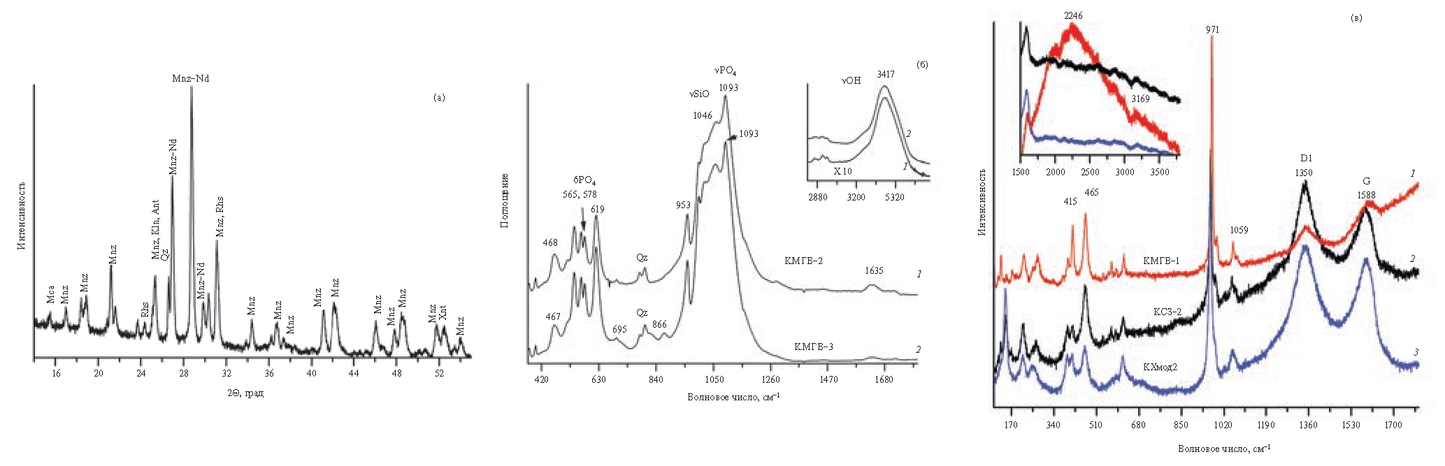 Рис. 4. Результаты: a – ПДР (КМГВ-3), Mnz – монацит, Mca – слюда, Qz – кварц, Rhs – родохрозит, Kln – каолинит, Ant – анатаз, Xnt – ксенотим.; б – ИК- (КМГВ-2, КМГВ-3); в – КР-спектроскопии (КМГВ-1, КС3-2, КХМОД2) НМ Куларского хребта. В КР спектрах всех образцов зафиксированы полосы – D1, G разупорядоченного УВ.