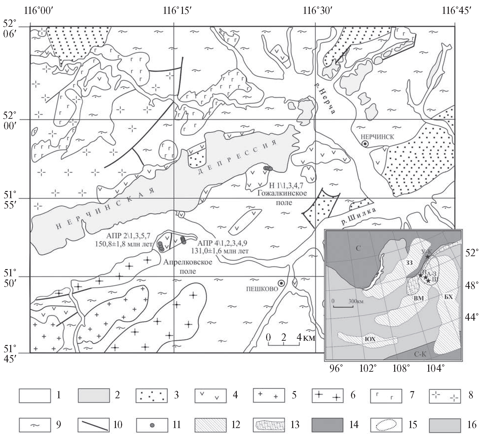 Рис. 1. Схема геологического строения Нерчинской впадины. При составлении использованы материалы [1]. На врезке приведена схема размещения позднемезозойских магматических областей в пределах Центральной Азии. При составлении использованы материалы [11]. Условные обозначения для схемы геологического строения: 1–3 –рыхлые отложения: 1 – QII-IV, 2 – N2-Q1, 3 – K1; 4 – позднемезозойские вулканиты шадоронской и ундинодаинской серий без разделения; 5 – позднеюрские граниты; 6 – каменноугольные граниты и гранодиориты; 7 – палезойские мафические породы; 8 – палеозойские сиалические породы без разделения по возрасту; 9 – протерозойские геологические комплексы; 10 – разломы; 11 – точки опробования. Условные обозначения для врезки: 12 – области в составе позднемезозойской магматической провинции востока Азии (ЗЗ – Западно-Забайкальская, ВМ ‒ Восточно-Монгольская, БХ – Большехинганская, ЮХ- Южно-Хангайская); 13 – структуры Монголо-Охотского пояса; 14 – платформы (С – Сибирская, С-К – Северо-Китайская); 15 – зона перекрытия Восточно-Монгольской и Большехинганской областей; 16 – Центрально-Азиатский складчатый пояс. Звёздочками показаны (вне масштаба) депрессии и связанные с ними вулканические ассоциации: Н – Нерчинская, А-З – Александрово-Заводская, Ш – Шадоронская, УК – Усть-Карская.