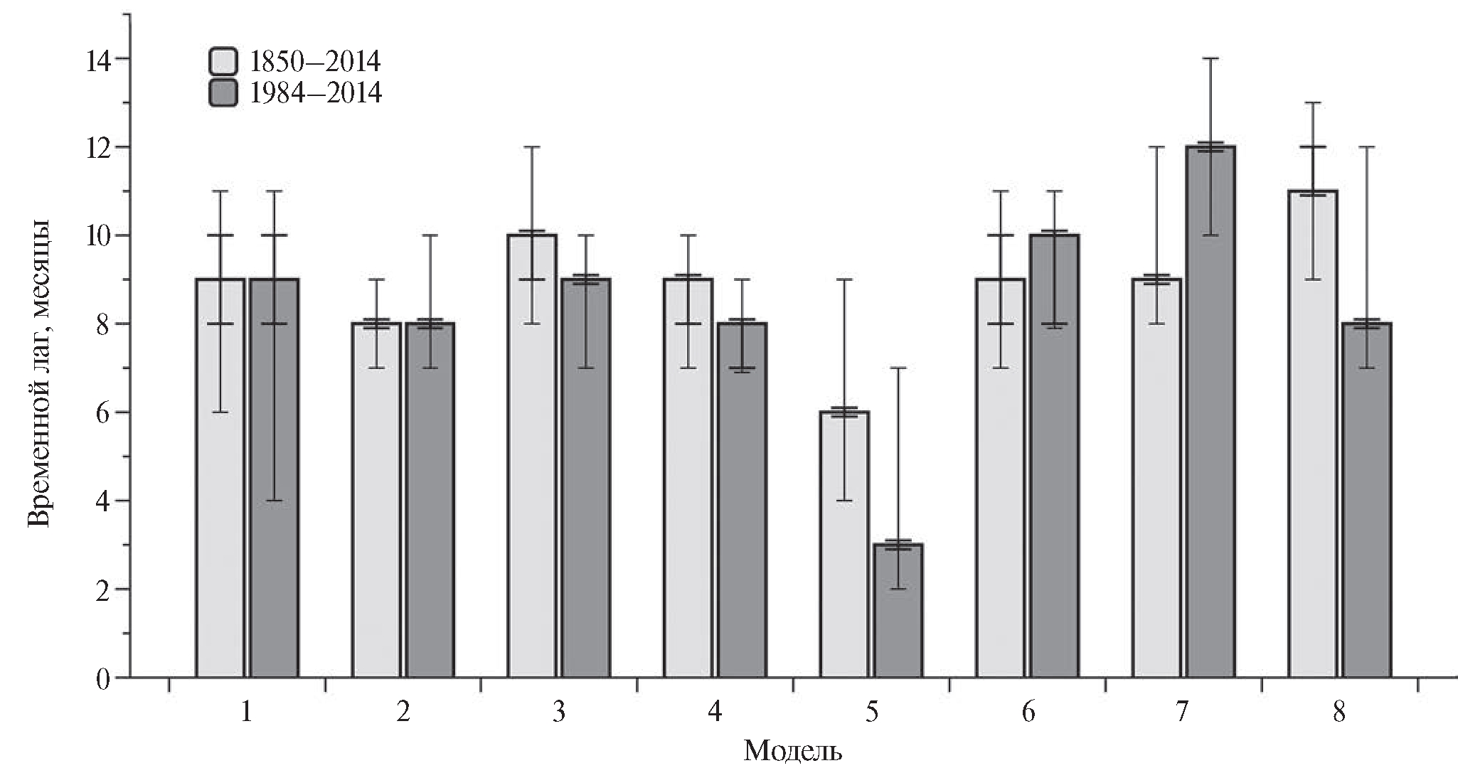 Рис. 2. Лаговая статистика для исходных рядов для глобальной приповерхностной температуры T и содержания СО2 в атмосфере q, полученных в численных экспериментах с моделями CMIP6 (положительные значения – T опережает q, отрицательные значения – q опережает T) при сценарии esm-hist для временных интервалов 1850–2014 (светлые столбики) и 1984–2014 гг. (тёмные столбики). Линиями показаны 99% интервалы неопределённости.