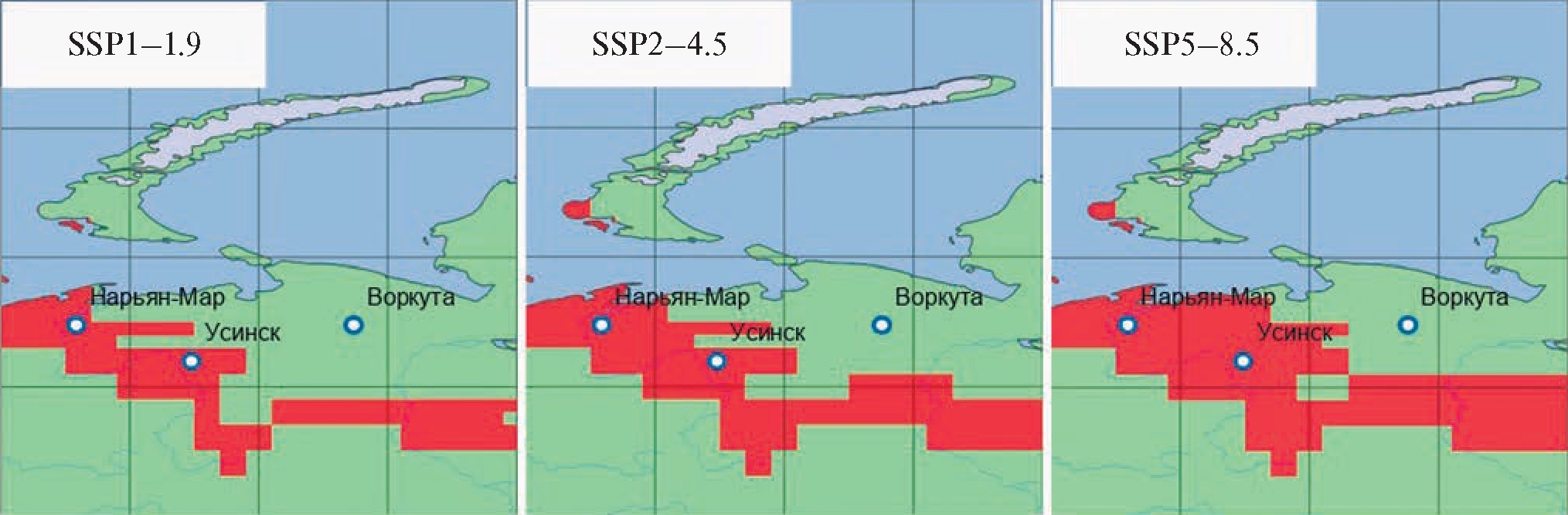 Сценарий SSP5-8.5 предполагает, что мировая экономика будет бурно развиваться, используя ископаемое топливо в качестве основного источника энергии и поддерживая энергоёмкий образ жизни. Этот сценарий рассматривается как крайне нежелательный, так как его реализация переложит все проблемы, связанные с глобальным изменением окружающей среды и климата, на плечи следующих поколений. Поэтому прогностические оценки смещения климатологической границы многолетней мерзлоты, соответствующие этому сценарию представляют интерес с точки зрения теоретически возможного масштаба деградации многолетней мерзлоты. Они показывают, что освобождение северо-восточной части Большеземельской тундры от многолетней мерзлоты в течение следующих трёх десятилетий можно считать маловероятным.