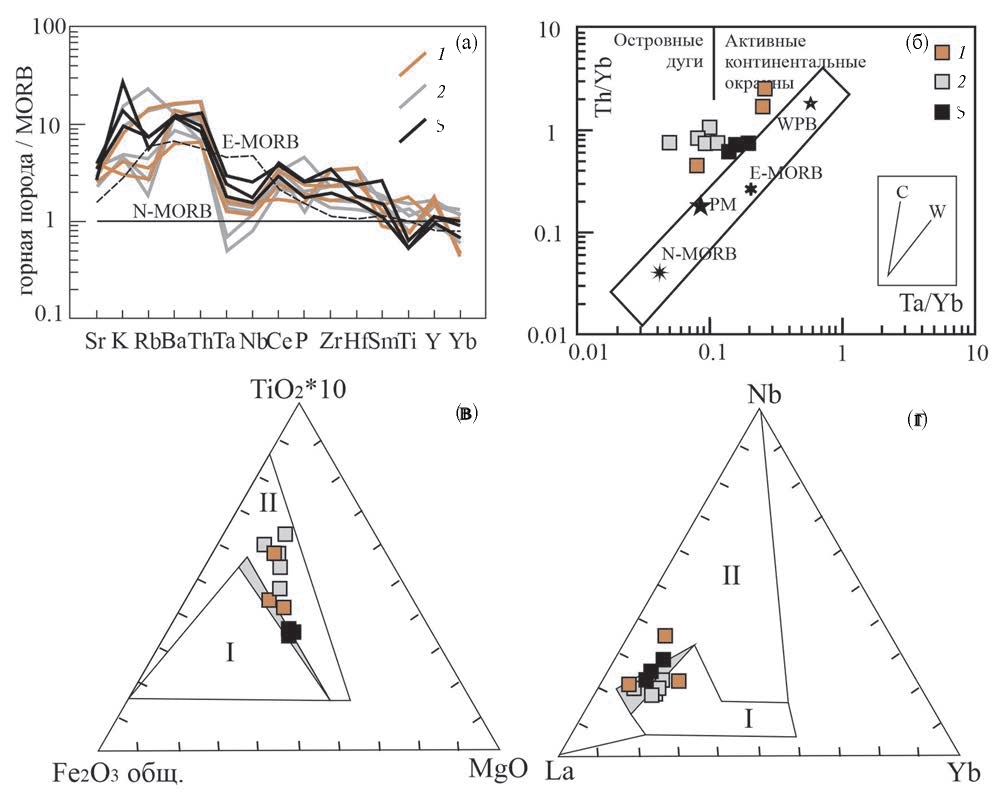 Рис. 3. Спайдер-диаграмма (а) и дискриминантные диаграммы (б‒г) для нижнекаменноугольных вулканитов восточного склона Урала. Точки и графики составов базальтов: 1 – косьинской свиты, 2 – медногорской свиты, 3 – бекленищевской свиты. Эталонные составы MORB (N-MORB) и E-MORB по [19]; б: диаграмма Ta/Yb–Th/Yb по [18]. Средние составы пород эталонных обстановок: N-MORB и E-MORB по [19], PM (примитивной мантии), по [20], WPB (базальтов внутриплитных обстановок) по [16]. Тренды составов магматических серий, обусловленные коровой контаминацией (С) и дифференциацией мантийных магм (W) по [14]; в, г: диаграммы Fe2O3общ–TiO2×10–MgO и La–Nb–Yb для разделения магматических образований надсубдукционных конвергентных (I) и трансформных (II) обстановок по [3]. Серый фон – область неопределённости.
