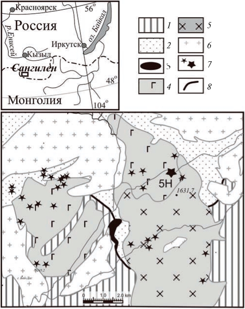 Рис. 1. Схема расположения камптонитовых даек агардагского комплекса Западного Сангилена (Юго-Восточная Тува) по [15]. 1 – докембрийские метаморфизованные терригенно-карбонатные породы моренского комплекса; 2 ‒ кембрийские вулканогенно-осадочные породы; 3 – гипербазиты; 4 – габброиды Правотарлашкинского и Башкымугурского массивов; 5 ‒ монцодиориты Башкымугурского массива; 6 ‒ ордовикские гранитоиды; 7 ‒ дайки камптонитов агардагского комплекса, крупной звездой показана дайка с мегакристами оливина; 8 ‒ разломы.