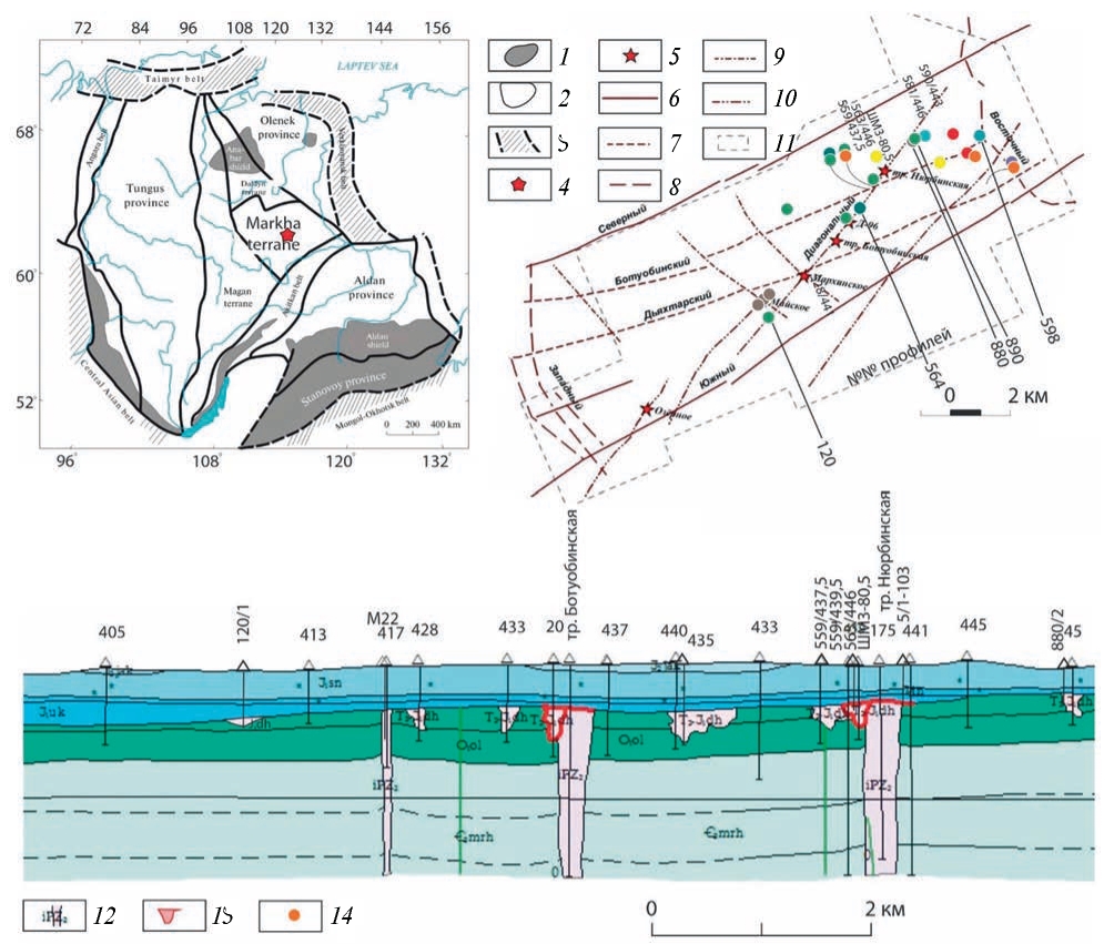 Рис. 1. Схема центральной части Среднемархинского алмазоносного района (б) и проекция разреза через карстовые полости, ассоциирующиеся с кимберлитами. 1 – докембрийский фундамент; 2 – пострифейский осадочный чехол; 3 – фанерозойские подвижные пояса; 4 – Среднемархинский алмазоносный район; 5 – известные кимберлитовые тела; 2–7 – осевые зоны разрывных нарушений, выделенные по данным магниторазведочных, сейсморазведочных работ и картирования микротектонических нарушений: 6 – Вилюйско-Мархинской зоны низкого порядка, 7 – Вилюйско-Мархинской зоны высокого порядка, 8 – Среднемархинской зоны низкого порядка, 9 – Среднемархинской зоны высокого порядка (поперечные), 10 – рудоконтролирующий Диагональный; 11 – граница Накынского кимберлитового поля; 12 – кимберлитовые трубки и дайки, 13 – дяхтарская толща, 14 – точки опробованных скважин (цветовая палитра кружков отражает окраску исследованной тонкодисперсной фракции, выделенной при отмучивании).