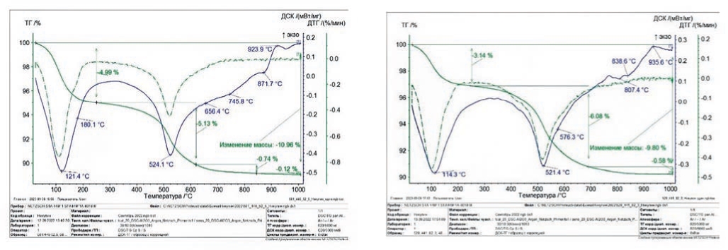 На термических кривых наблюдаются эффекты, свойственные монтмориллониту, хлориту, серпентиниту, иллиту и каолиниту. На графике 4а дегидратация монтмориллонита фиксируется на кривой ДСК в температурном интервале 100–300°С. О насыщении монтмориллонита межслоевыми катионами Ca и Mg свидетельствует дополнительный эндоэффект при температуре 180.1°С. В температурном интервале 400–600°С происходит дегидроксилизация монтмориллонита и каолинита, эндоэффекты которых накладываются друг на друга. Дегидроксилизация хлорита протекает поэтапно. Сначала, при температуре 550–700°С удаляется структурная вода из бруситоподобного слоя, а затем, при 710–800°С – из талькоподобного слоя. Экзотермический эффект с максимумом при 923.9°С обусловлен образованием форстерита, а затем шпинели (рис. 3 б). На кривых ДСК образцов, где гидрослюда преобладает, наблюдается низкотемпературный эндотермический эффект с максимумом при температуре 114.3°С и второй, с максимумом при температуре 573.3°С, пересекающийся с эффектом дегидроксилизации каолинита (521.4°С). Эндоэффект с максимумами при температурах 807.4 и 838.6°С отвечает за разрушение структуры минерала и удаление групп OH минерала группы серпентинита (рис. 3 б).