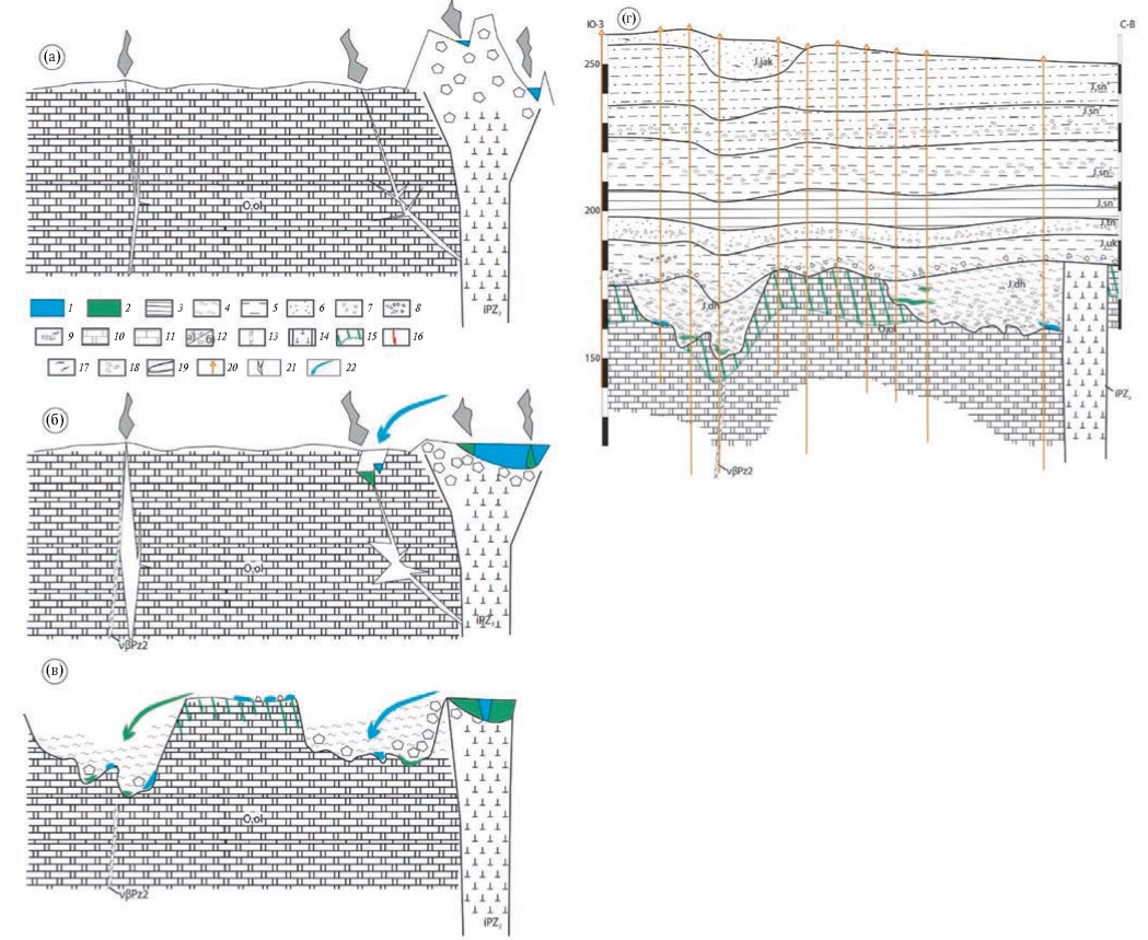 1 – резервуары смектитизации кимберлитового вещества, 2 – зоны гидрослюдизации смектитов; 3 – аргиллиты; 4 – глины; 5 – алевролиты; 6 – пески разнозернистые; 7 – галька; 8 – гравий и щебни; 9 – конгломераты и брекчии; 10 – доломиты; 11 – известняки; 12 – обломки магматических пород: а) базитов, б) кимберлитов; 13 – дайка основного состава; 14 – кимберлитовая трубка; 15 – кора выветривания; 16 – тектонические нарушения (разломы); 17 – ископаемые стволы и ветви; 18 – ракушняк; 19 – стратиграфическая граница; 20 – ствол скважины; 21 – каналы вывода гидротермальных флюидов, 22 – делювиальные и пролювиальные потоки сноса глин, связанных с кимберлитовым магматизмом.