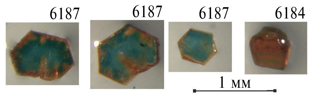 В настоящей работе изучены два образца из трубки Удачная (рис. 2): обр. 6184 (коричневые гексагональные таблитчатые кристаллы) и обр. 6187 (голубые гексагональные пластинки с коричневой каймой).