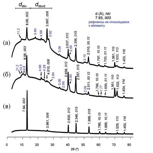 Рис. 5. Порошковые рентгенограммы минералов надгруппы гидроталькита из кимберлитовой трубки Удачная: (а, б) разные кристаллы из образца 6187; (в) однородный айоваит, образец 6184.