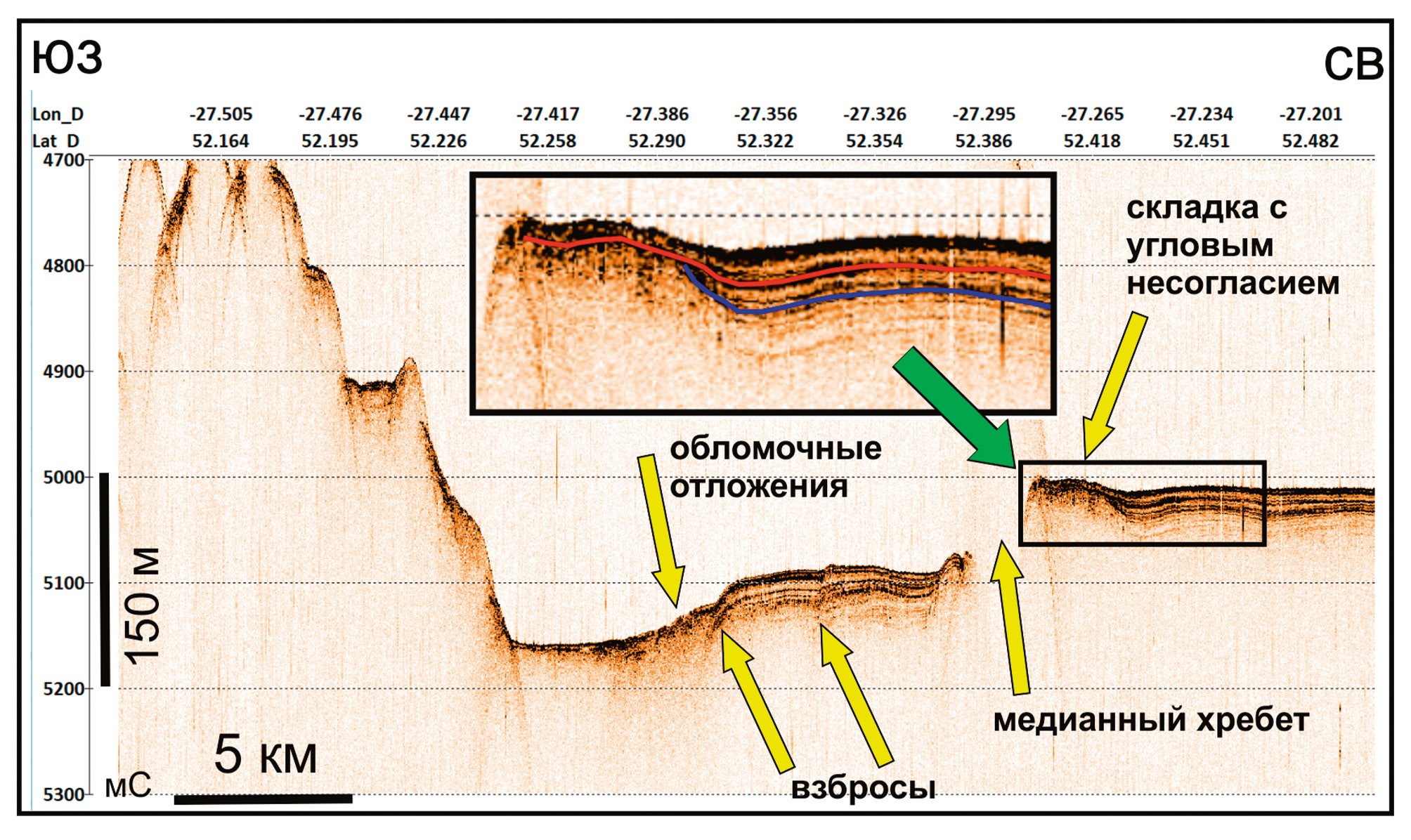 Разрез через северный трансформный трог ЧГ показан на рис. 4. В его осевой части выделяется медианный хребет, в обрамлении которого в осадках видны складки, указывающие на современное протыкание хребтом осадочной толщи. Складка с северного борта медианного хребта имеет в замке угловое несогласие с рефлектором, залегающим на глубине около 6 мс поверх разрушенного эрозией замка складки. Осадочный слой, для которого этот рефлектор является подошвой, также деформирован над складкой, что указывает на продолжающееся вертикальное движение хребта и примыкающей к нему осадочной толщи. В связи с этим разломы к югу от хребта интерпретируются как взбросы. Эту точку зрения подкрепляет наличие осадков с акустической мутностью к югу от приподнятого сегмента со стратифицированными осадками. Таким образом, можно заключить, что северный трог ЧГ находится на современном этапе в условиях транспрессии, которая сопровождается формированием медианного хребта при выжимании глубинного вещества и формированием специфических деформаций осадочного чехла.