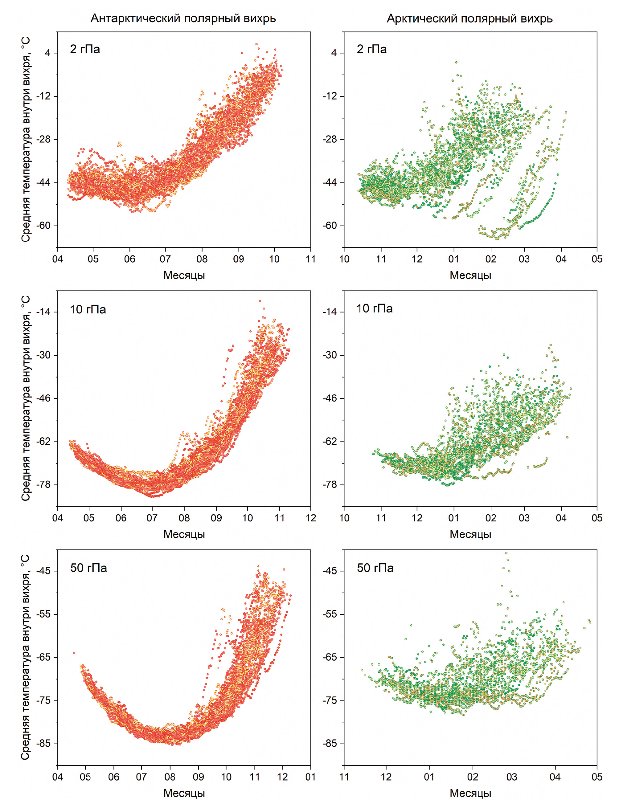 Рис. 3. Внутригодовые среднесуточные изменения средней температуры внутри антарктического и арктического полярных вихрей на уровнях 2, 10 и 50 гПа с 1979 по 2021 гг.