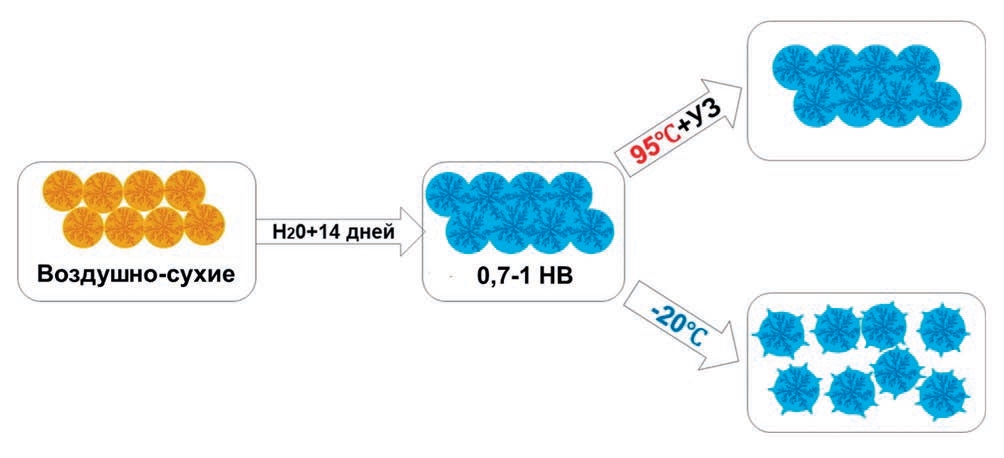 Полученные результаты говорят о том, что при увлажнении воздушно-сухих почв до значений НВ влага равномерно распределяется по образцу в течение 14 суток, а последующая заморозка позволяет разорвать связи между НМО в почвенных гелях за счёт расширения заключённой в них воды. Схема этого процесса представлена на рис. 3.