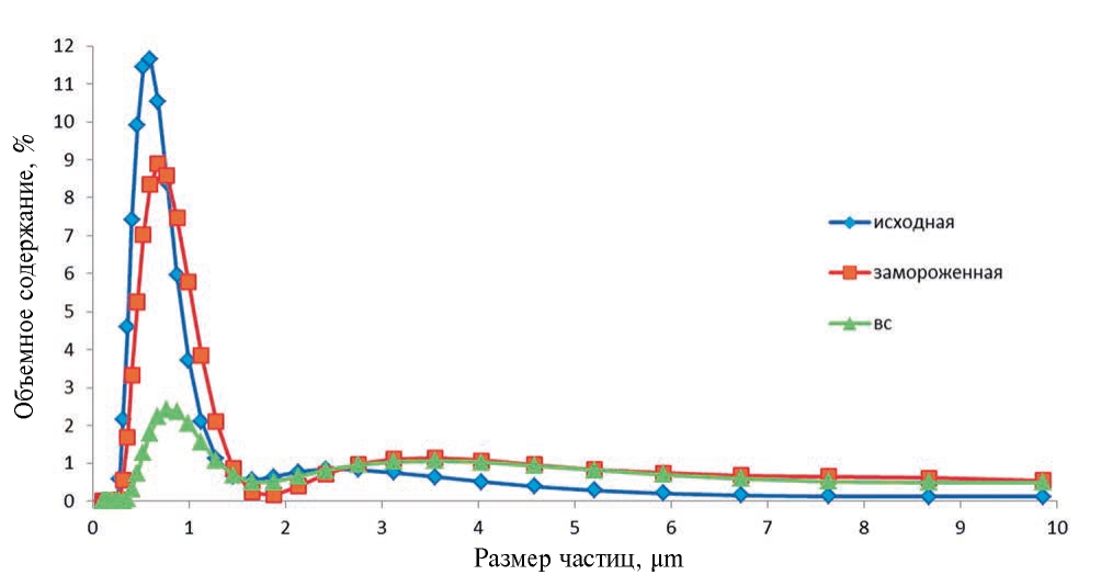На следующем этапе исследования мы проверили результаты вискозиметрии. Для этого методом лазерной дифрактометрии сравнили содержание частиц илистой фракции, а также мелкой и средней пыли в образце чернозёма: не подвергавшегося высушиванию, воздушно-сухого и восстановленного замораживанием. Результаты экспериментов показали (рис. 4), что замораживание приводит к заметному росту числа мелких частиц в восстановленном замораживанием почвенном образце по сравнению с его воздушно-сухим аналогом. Это подтверждает данные вискозиметрии: замораживание увлажнённых почв увеличивает количество свободных НМО, не связанных с почвенными гелями.