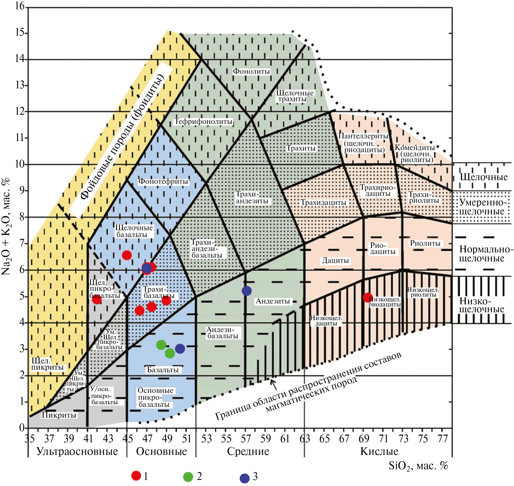 Рис. 2. Диаграмма “сумма щелочей–кремнезём” (Total Alkali Silica) для вулканитов Башкирского мегантиклинория (Южный Урал) [8]. Базальты: 1 — Тараташского антиклинория (RF1ai); 2 — Ямантауского антиклинория (RF2ms); 3 — Тирлянской синклинали (RF4ig). Стратиграфические индексы, RF– рифей: RF1– нижний (бурзяний), RF2 — средний (юрматиний), RF4 – терминальный (аршиний), Свиты: ai – айская, ms – машакская, ig – игонинская.