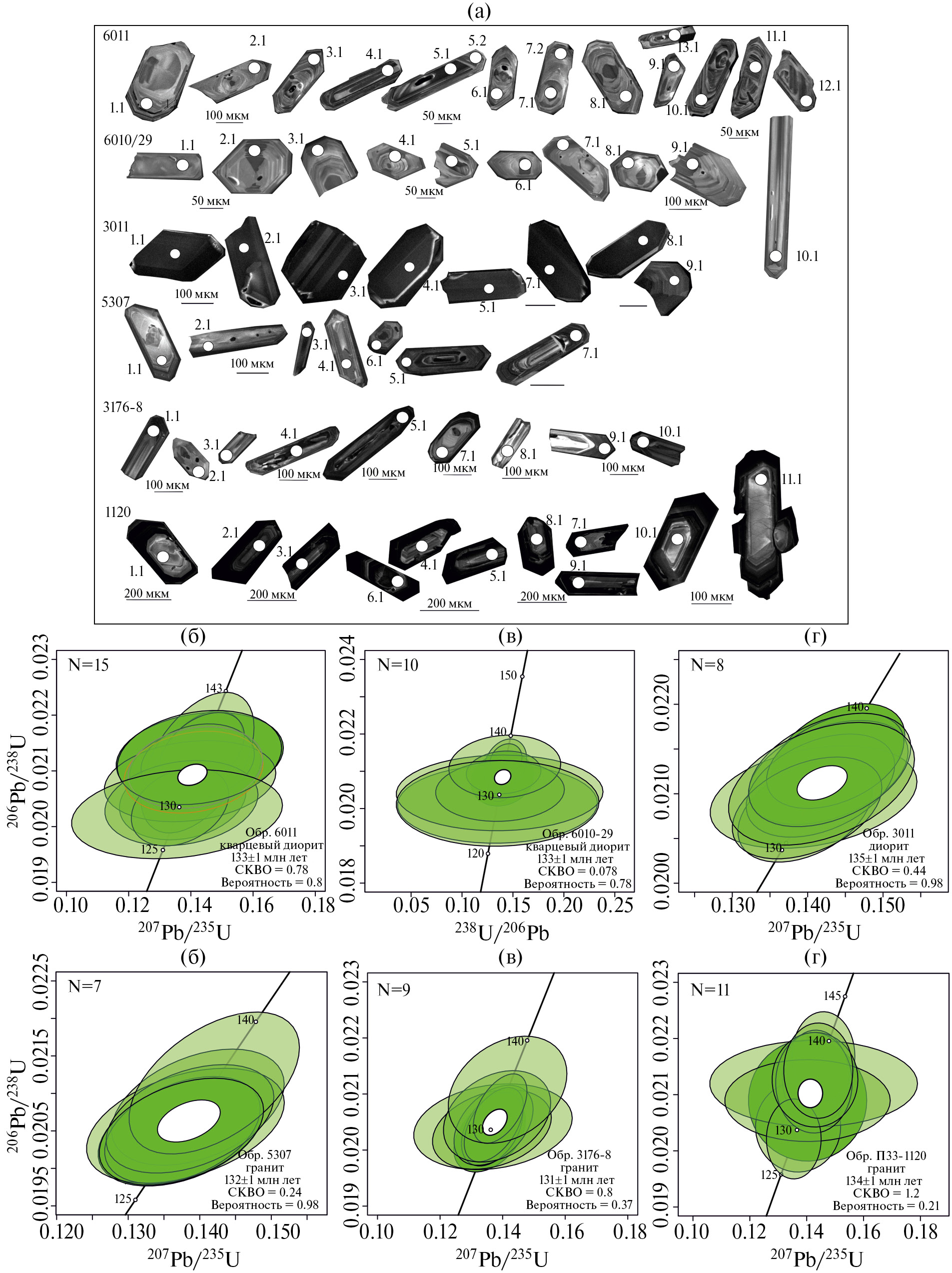 Рис. 2. Микрофотографии кристаллов циркона в режиме катодолюминесценции (а) и диаграммы с конкордией (б–ж) для циркона из гранитоидов арга-эмнекенского (обр. 6011, 6010-29, 3011), омчикандинского (обр. 5307, 3176-8) и саханьинского (обр. П33-1120) комплексов. Номера точек соответствуют номерам в таблице 1.