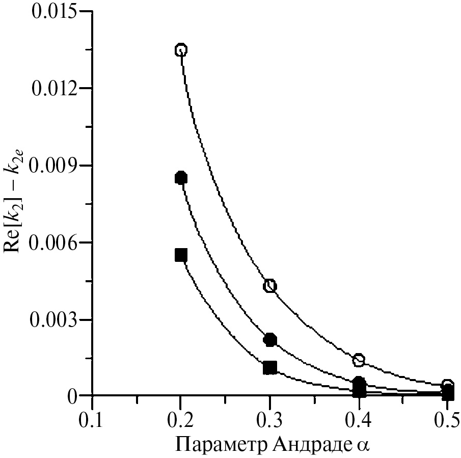 Рис. 2. Отклонение реальной части числа Лява k2 от упругого значения в зависимости от значения параметра Андраде α для тестовой многослойной неупругой модели (в коре вязкость принята η0, в оливиновой мантии 10–2η0, в слое β ‒ 10–1η0, в слое γ — η0): η0=1021 Па с (белые кружки), η0=1022 Па с (чёрные кружки), η0=1023 Па с (чёрные квадраты).