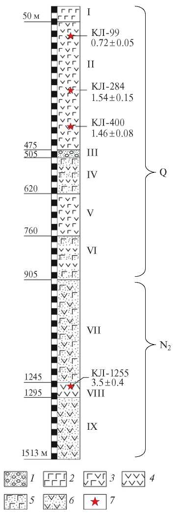 Рис. 2. Литологическая колонка скважины Кл-1. 1 — песчано-валунная толща, 2 – 4 — лавы (2 — базальты, 3 — андезибазальты, 4 — андезиты), 5–6 — туфы (5 — основного, 6 — среднего состава), 7 — точки отбора образцов на K–Ar-датирование (подписаны индексы образцов и возраст в млн лет)