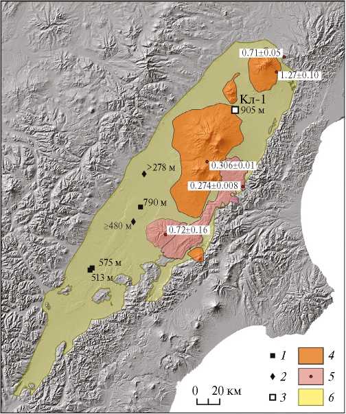Рис. 3. Оценки мощности осадочного заполнения ЦКД (1 – по [11]), 2 – по [16], 3 – скважина Кл-1) и возраста вулканитов, выходящих на дневную поверхность (4 – верхний плейстоцен – голоцен [17], 5 – средний плейстоцен и древнее, включая точки определения абсолютного возраста в млн лет [12 – 15]; 6 – распространение четвертичных отложений внутри ЦКД)
