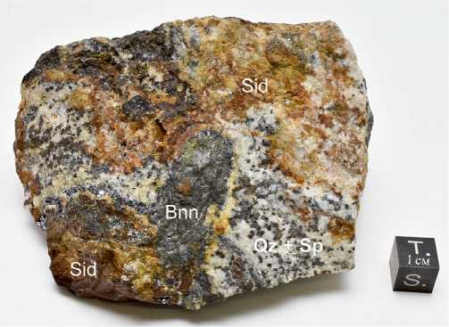Рис. 1. Образец FMM_1_74896 из месторождения Кон-Дара (Юго-Западный Памир, Таджикистан) с Ag-содержащим тетраэдритом-(Cd). Коллекция Минералогического музея им. А.Е. Ферсмана РАН (Москва, Россия). Обозначения минералов в соответствии с [2]: Bnn — бурнонит, Sp — сфалерит, Qz — кварц, Sid – сидерит