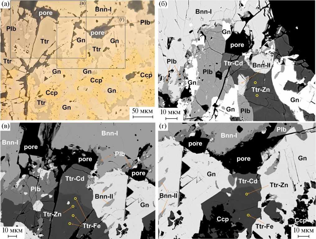 Рис. 4. Увеличенные фрагменты зерна, представленного на рис. 3, с Ag-содержащим тетраэдритом-(Cd). (а) Увеличенный фрагмент зерна с рис. 3а. Тесные срастания тетраэдрита, галенита-II, халькопирита и полибазита внутри агрегата бурнонита-I. Халькопирит имеет дендритоподобные выделения, которые внедряются и секут галенит-II, а также врастают в тетраэдрит. (б-г) Укрупнённые фрагменты рис. 3в и 4а: (б) Полибазит образует тесные срастания с тетраэдритом и галенитом-I на контакте с бурнонитом-II. (в‒г) Тесные срастания тетраэдрита, сложенного тремя крайними Fe-, Znи Cd-членами тетраэдритового твёрдого раствора, галенита-II, полибазита, бурнонита-II и халькопирита внутри агрегата бурнонита-I. Тетраэдрит-(Cd) образует тесные срастания с полибазитом и располагается ближе всех из трёх тетраэдритов к контакту бурнонита-I. Вдоль границы тетраэдрита-(Cd) и бурнонита-I характерно наличие пор и отсутствие непосредственного контакта этих двух минералов. Тетраэдрит-(Fe) тяготеет к контакту с халькопиритом. Тетраэдрит-(Zn) занимает промежуточное между тетраэдритом-(Cd) и тетраэдритом-(Fe) положение. Бурнонит-II присутствует в галените, тетраэдрите и полибазите в виде вытянутых включений