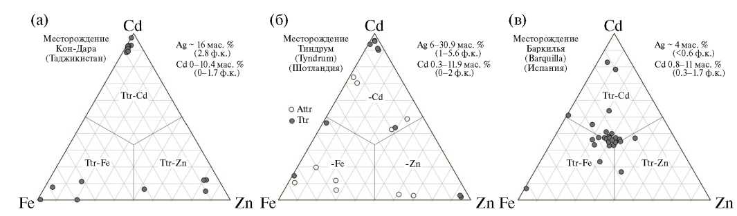 Рис. 6. Содержания двухвалентных металлов Cd, Zn и Fe в минералах группы блёклой руды из месторождения Кон-Дара (Таджикистан) (данная работа) (а) в сравнении с таковыми из месторождений Тиндрум (Шотландия) (график построен авторами на основании анализов, приведённых в работах [3, 4]) (б) и Баркилья (Испания) (рис. 7 из [6] с дополнениями) (в)