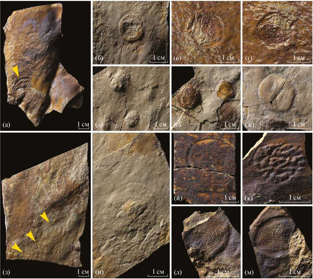 Рис. 2. Различные варианты сохранности остатков отдельных индивидуумов предположительно Beltanelliformis konovalovi из чернокаменской свиты на Широковском водохранилище: а – обр. № CU21/3-64, синекаменская подсвита; б – обр. № CU20/6-1, вилухинская подсвита; в – обр. № CU22/9-56, синекаменская подсвита; г – обр. № CU22/9-2, синекаменская подсвита, противоотпечаток (в); д – обр. № CU20/6-4, вилухинская подсвита; е – обр. № CU21/2-6, вилухинская подсвита; ж – обр. № CU 22/10-34, вилухинская подсвита; з – обр. № CU22/9-101, синекаменская подсвита, B. konovalovi показан жёлтыми стрелками; и – обр. № CU21/3-61, синекаменская подсвита; й – обр. № CU21/3-73, синекаменская подсвита; к – обр. № CU21/3-15, синекаменская подсвита; л – обр. № CU22/9-20, синекаменская подсвита; м – обр. № CU22/9-19, синекаменская подсвита, противоотпечаток (л)