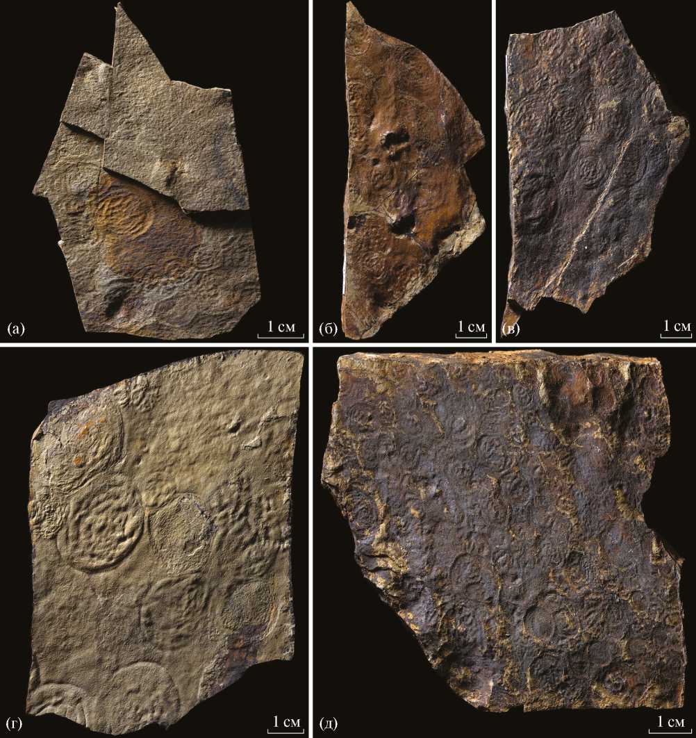 предыдущих находок, новый палеонтологический материал из вилухинской и синекаменской подсвит демонстрирует более высокое разнообразие форм сохранности, которое позволяет однозначно интерпретировать данные остатки, как прижизненно захоронённые оладьеобразные тела, имеющие стенку и, предположительно, разделённую на отсеки, внутреннюю полость, частично заполненную осадком, что в свою очередь принципиально отличается от ранее описанных представителей рода Beltanelliformis Menner, 1974 [10, 11]. Кроме того, нам удалось обнаружить наиболее интригующие находки, представленные комбинированными остатками совместно сохранившихся тел и, предположительно, следов их перемещения (рис. 4), что также не характерно для представителей рода Beltanelliformis. В ряде случаев они состоят из борозды, перпендикулярно рассечённой субпараллельными валиками и канавками одинаковой амплитуды, ширина которой повторяет или близка к диаметру тела организма (рис. 4а, б), при этом, не имеющая чёткой границы с окружающей поверхностью слоистости мелкозернистого песчаника или алевролита и напоминающая след питания (пастьбы) на микробном субстрате. В других случаях возможный след перемещения имеет резкие границы (рис. 4в, г); его ширина соответствует ширине тела организма, но длина существенно меньше, что может свидетельствовать о незначительном перемещении в погребённом (предсмертном) состоянии внутри осадка. Также к комбинированным остаткам можно отнести экземпляры, представленные как отпечатками тел организмов и широкими следами их пастьбы, так и узкими синусоидальными параллельными бороздками, похожими на отпечатки следов ползания, однако, имеющими ширину в несколько раз меньше диаметра предполагаемого организма (рис. 4д).