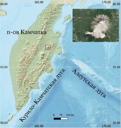 Вулкан Шивелуч – наиболее активный эксплозивный центр полуострова Камчатка [5, 11, 18], расположенный к западу от стыка Курило-Камчатской и Алеутской островных дуг (рис. 1). В историческую эпоху было зафиксировано два катастрофических извержения в 1854 и в 1964 годах [5], а за последние 10 тыс. лет на вулкане произошло не менее 60 крупных пароксизмальных извержений, связанных со значительным выбросом пепловых облаков, образованием мощных пирокластических потоков и обломочных лавин [18]. Из-за частых эксплозивных событий Шивелуч представляет опасность не только для окрестных населённых пунктов (Ключи, Усть-Камчатск, расположенные в 45 и 85 км соответственно). Во время крупных извержений его пепловые облака поднимаются на высоту до 20 км и легко переносятся на большие расстояния, очевидно представляя опасность для проходящих в непосредственной близости от Камчатки международных авиалиний.