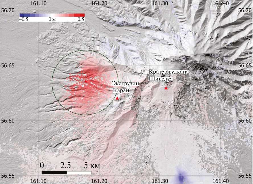 Далее была вычислена карта суммарных смещений Ulos за период времени с 01.05 по 17.08 2023 г. После 17 августа площадь когерентной области на западном склоне существенно уменьшается. Для интерферограмм, на которых выявлены заметные поднятия на западном склоне, область деформаций можно ограничить окружностью радиусом в 3 км (рис. 2), в пределах которой суммарные максимальные смещения на спутник (в направлении LOS) за указанный период времени превышают 0.4 м.