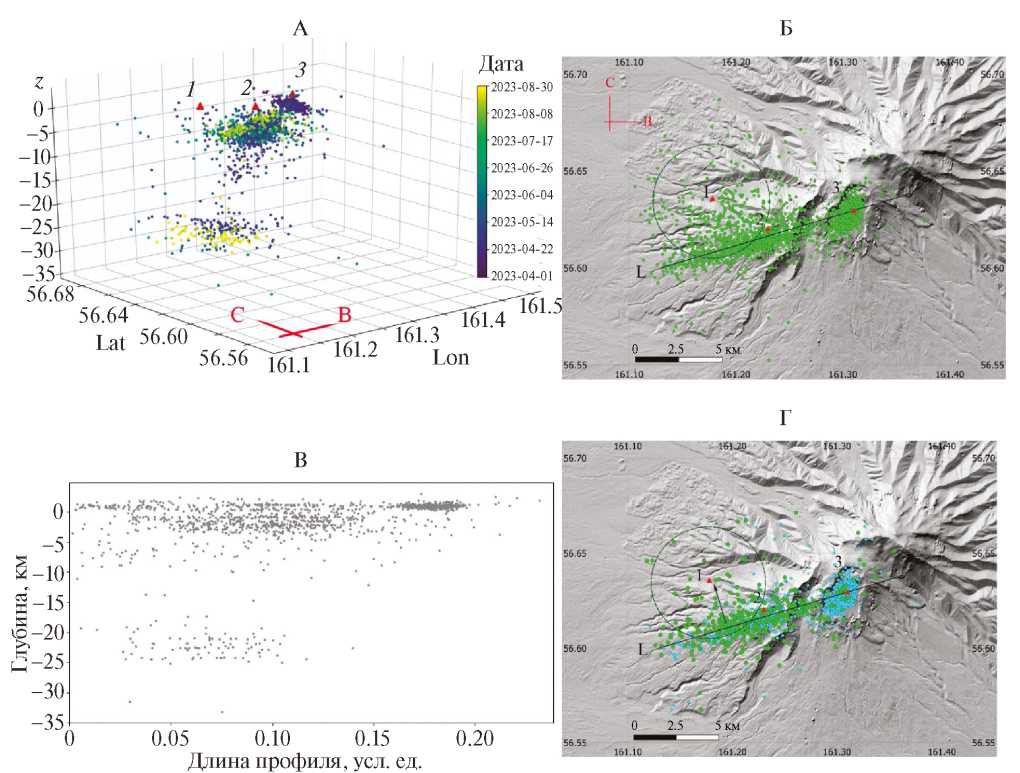 Рис. 3. А – распределение гипоцентров по глубине и по времени с 1 апреля по 31 августа 2023 г., Б – проекции всех гипоцентров на горизонтальную поверхность, В – проекции гипоцентров на профиль L (запад – восток). Длина профиля равна ~ 15 км, Г – распределение эпицентров за апрель-май 2023 г., глубина < 15 км. Цифрами обозначены центр смещений (1), экструзии Каран (2), кратер вулкана (3). Прямая линия – профиль L. Чёрной стрелкой на рис. Г показано направление миграции сейсмических событий в верхнем горизонте