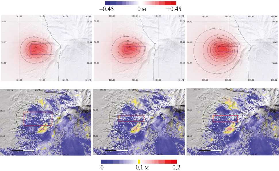 Задача определения параметров трещины (l, w, h) путём минимизации невязки между измеренным и рассчитанным по формулам (5), (6) полем смещений имеет единственное решение, но в пределах точности данных о смещениях имеются эквивалентные модели с различными параметрами и объёмом магматической интрузии. Например, в таблице 2 в моделях M1, M2 и M3 интрузии располагаются на глубинах 1, 1.5, 2 км соответственно, со средним значением невязки 2.7 см. В соответствии с изменением геометрических параметров интрузии и увеличением её глубины от 1 до 2 км, объём возрастает от 0.009 до 0.0129 км3. При расположении интрузии ниже 2 км невязка начинает расти и расхождение решения с исходным полем смещений становится существенным (табл. 2, модели M4, M5). На рис. 4 в верхнем ряду показаны поля смещений, рассчитанные по моделям М1, М2, М3. Они хорошо согласуются с реальным полем смещений, полученным по спутниковым данным. В нижнем ряду рис. 4 показаны невязки, соответствующие этим моделям. В области смещений невязки в основном имеют значения близкие к нулю (на рисунках преобладает синий цвет). Высокие расхождения невязок (жёлтые и красные оттенки) находятся за пределами исследуемой области и связаны с процессами, не включёнными в нашу модель. На рис. 5В и Г показано сопоставление численных моделей и реального поля смещений вдоль профилей в направлении запад‒восток (А‒ А1) и север‒юг (В‒В1) соответственно.