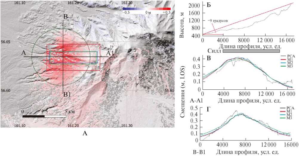 Рис. 5. А – поле смещений по спутниковым данным с проекциями интрузии в моделях М1, М2, М3 (красный, синий, зелёный цвет соответственно). Б – профиль рельефа вдоль линии А–А1 на рис. 5А; В, Г – сопоставление исходного поля смещений (серая линия) с расчётными смещениями по моделям М1, М2, М3 (соответственно красная, синяя и зелёная линии) вдоль профилей А–А1 (В) и В–В1 (Г), обозначенных на рис. 5А
