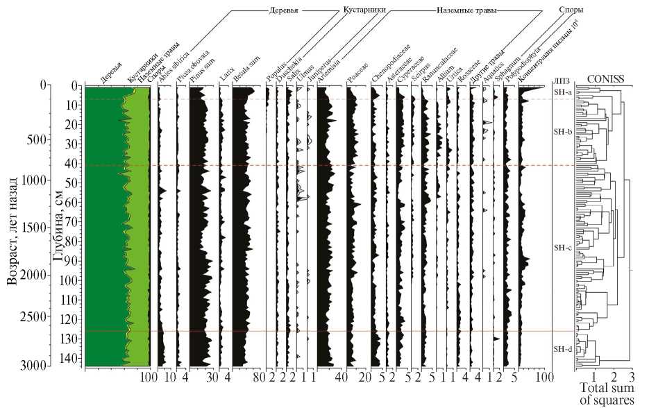 Для палинологического анализа отобран каждый сантиметр отложений. Процентное содержание пыльцевых таксонов рассчитано на основе суммы наземной пыльцы, принятой за 100%. На пыльцевых слайдах проведён подсчёт микрочастиц углей крупнее 100 мкм, рассматриваемых как индикаторы субрегиональных/ локальных пожаров [11]. Количество частиц угля рассчитано как их приток (шт/см2/год) путём умножения концентрации угля на скорость седиментации (см/год). Спорово-пыльцевая диаграмма построена в программе Tilia/TiliaGraph/TGView [12]. Локальные пыльцевые подзоны (SH-d – a) выделены на основе стратиграфически ограниченного кластерного анализа CONISS [12]. Описание литологического состава отложений проведено методом просмотра смер-слайдов в трёх повторностях. Процентное соотношение пыльцы полыни Artemisia и маревых Chenopodiaceae (A/Ch) использовано как показатель эффективного увлажнения на региональном уровне [2].