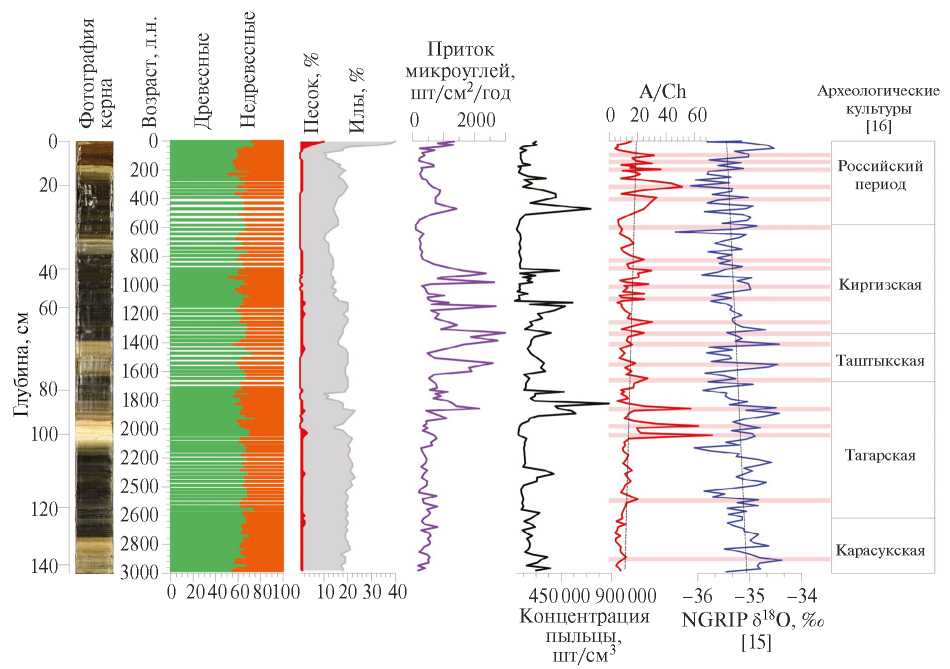 Позднее, 2650–880 л.н., на севере Минусинской котловины возросла роль луговостепных группировок. Повышенные значения концентрации пыльцы предполагают более высокую, чем ранее, пыльцевую продуктивность растительности котловины и/или более густой растительный покров. В горном окружении котловины сократилось участие темнохвойных пород деревьев или произошло повышение их нижней границы. Лиственница, вяз, ива продолжали быть важными элементами локальной растительности. Реконструированные изменения в составе растительности 2650‒880 л.н. предполагают континентальный, недостаточно влажный климата региона, который, однако, прерывался короткими эпизодами повышенного увлажнения, о чём свидетельствуют максимумы значений A/Ch 2040, 1980 и 1850 л.н. Слой “белёсых” илов, соответствующий похолоданию, формировался 2090–1950 л.н. Возможно, похолодание приводило к пониженному испарению, обеспечивая достаточное увлажнение для лугово-степных сообществ, что отражено в повышении индекса A/Ch в интервале 2650–880 л.н. до 16.