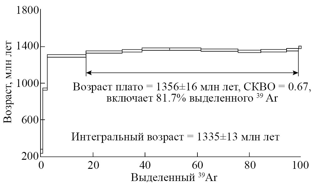 По результатам40Ar/39Ar-исследований флогопита получено плато с возрастом 1356±16 млн лет, СКВО = 0.67. Плато включает 81.7% выделенного 39Ar (рис. 4). Это значение относится к эктазийскому периоду мезопротерозоя. Согласно уточнённому возрасту подразделений рифея и их границ в структуре БМА [17; 18], возраст флогопита соответствует среднему рифею.