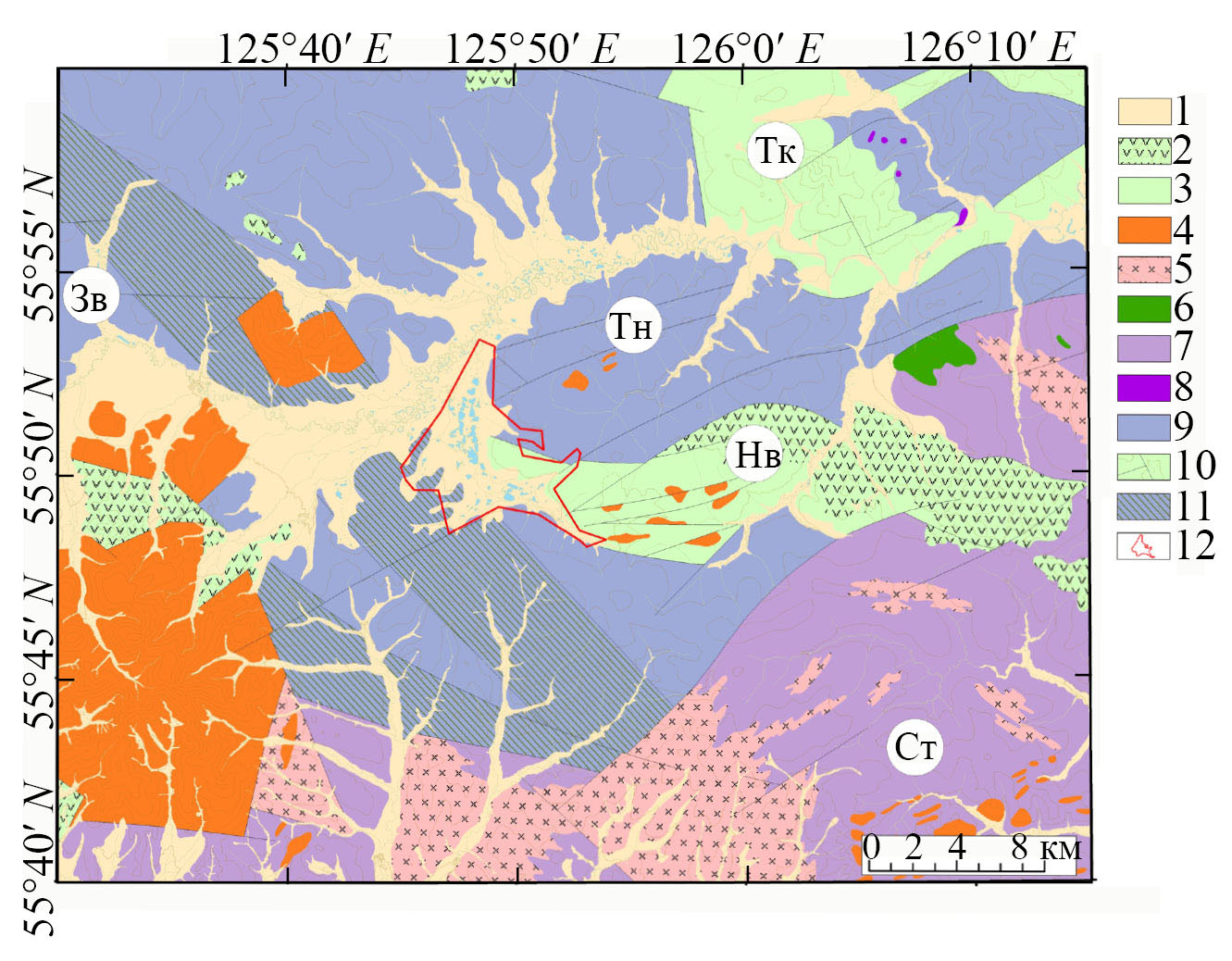 Рис. 1. Карта-схема расположения изученных объектов. 1 – кайнозойские отложения; 2 – мезозойские вулканические образования; 3 – мезозойские терригенно-осадочные породы, слагающие впадины (Нв – Невачинская); 4 – мезозойские щелочные массивы; 5 – протерозойские граниты; 6 – протерозойские основные породы; 7 – стратифицированные метаморфические комплексы Становой области (Ст) (протерозой); 8 – архейские ультраосновные породы; 9 – стратифицированные метаморфические комплексы Южно-Алданской области (архей) (Тн – Тангракский блок, Зв – Зверевский блок); 10 – разрывные нарушения; 11 – диафториты; 12 – площадь россыпи ручья Юрский.