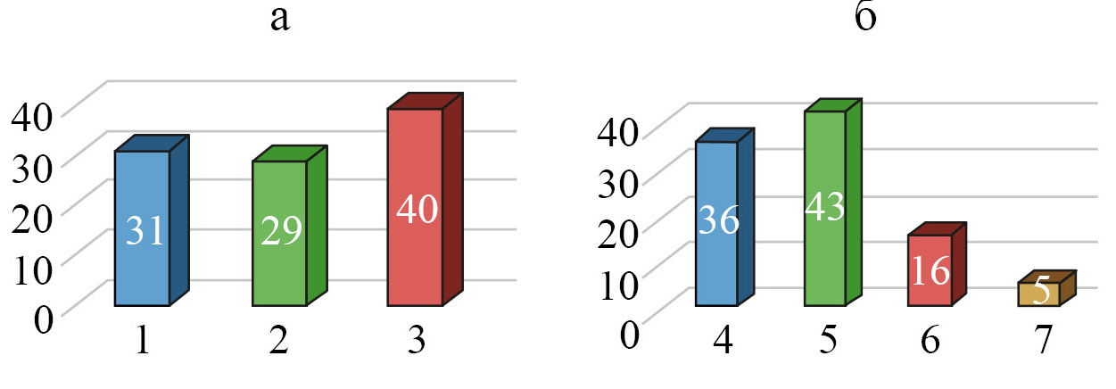 Рис. 2. Морфология золота (а) и гранулометрический состав самородного золота (б) из конгломератов, значения в%. Формы золота (а): 1 – комковидное, 2 – интерстициальное, 3 – пластинчатое. Размер золота (б), мм: 4 – <0.25; 5–0.25–0.5; 6–0.5–1; 7 – >1.
