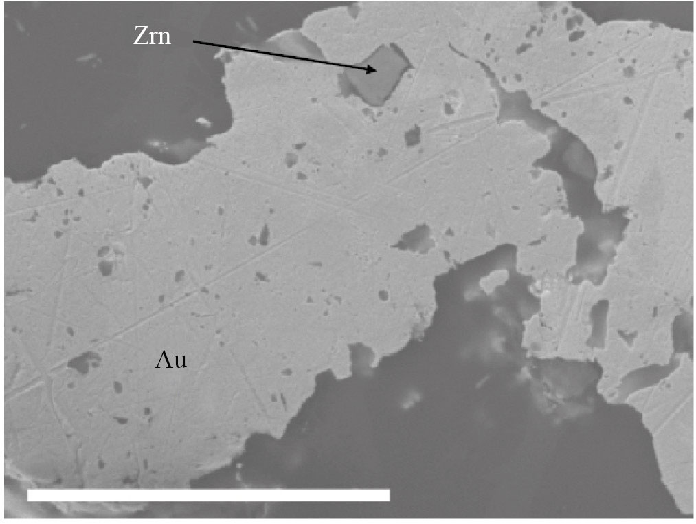 Рис. 4. Срез золота, в котором наблюдается неплотное срастание золота (Au) с цирконом (Zrn). Масштабная полоса 0.05 мм.