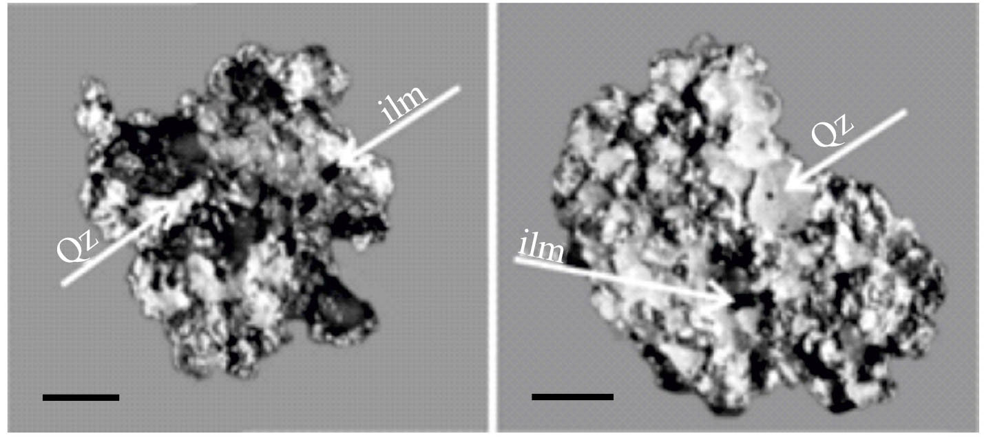 Рис. 5. Псевдорудное золото в конгломератах девонского возраста Тиманского кряжа. Qz – кварц, ilm – ильменит. Масштабная полоса 0.1 мм.