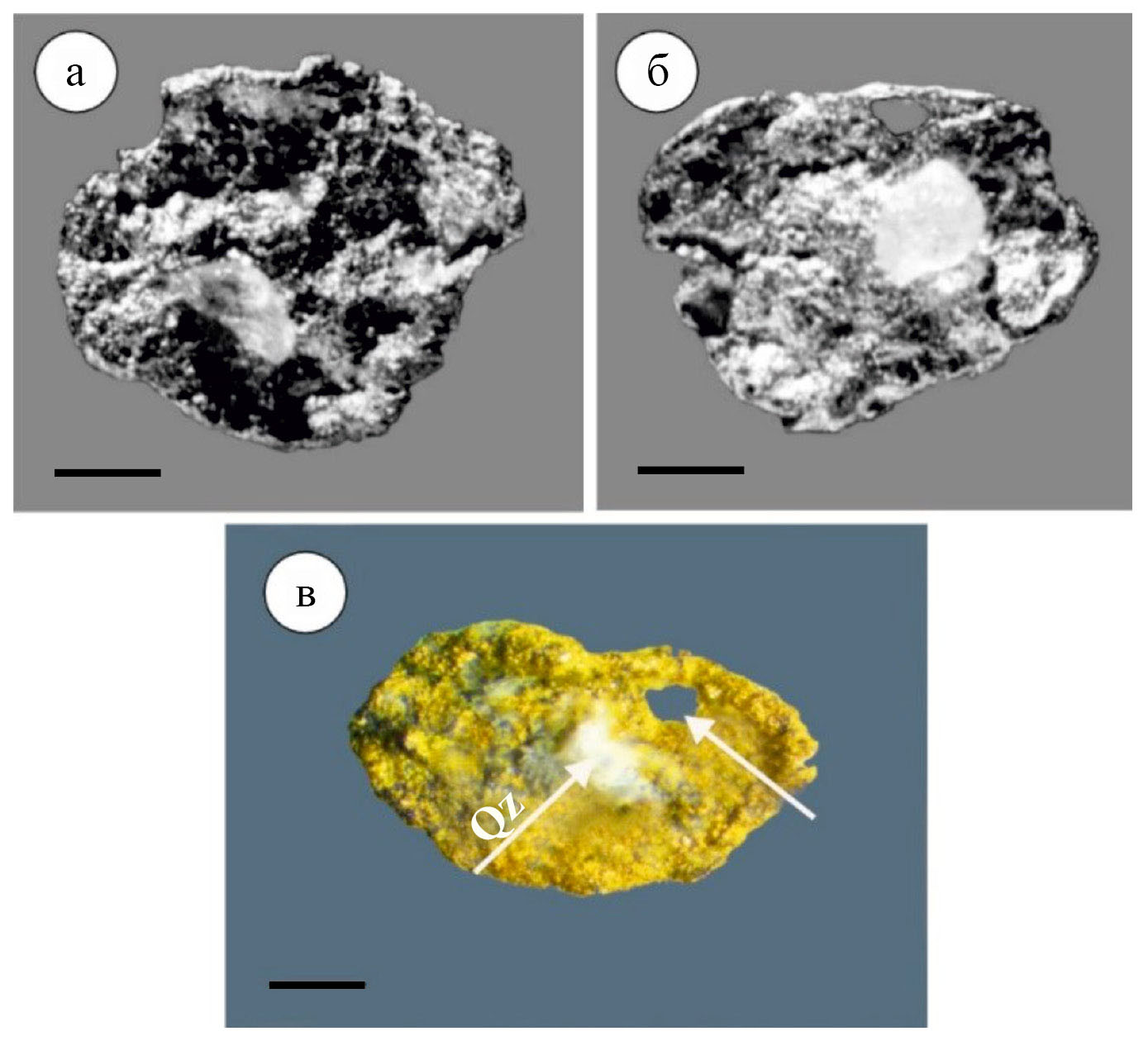 Рис. 6. а, б – поверхность золотин с отпечатками вдавленных в него минералов, полученных в результате эксперимента; в – поверхность золота из меловых конгломератов, на которой также наблюдается вдавленный кварц (Qz) и сквозное отверстие. Масштабная полоса 0.1 мм.