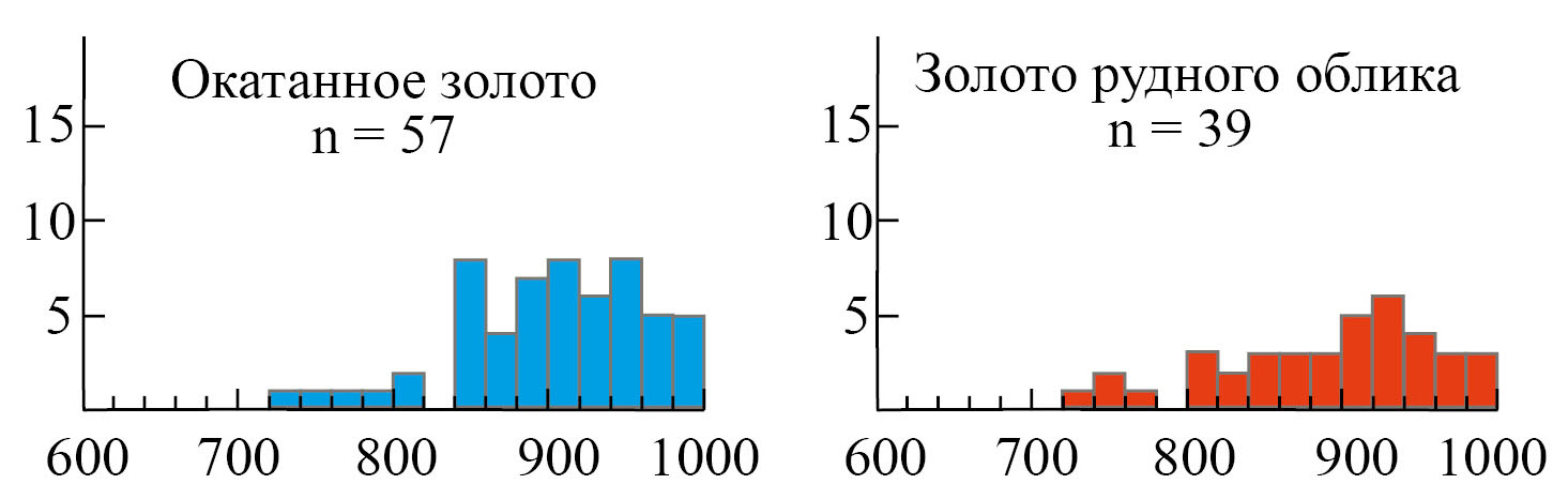 Рис. 7. Пробность хорошоокатанных и слабоокатанных форм и агрегатов золота.
