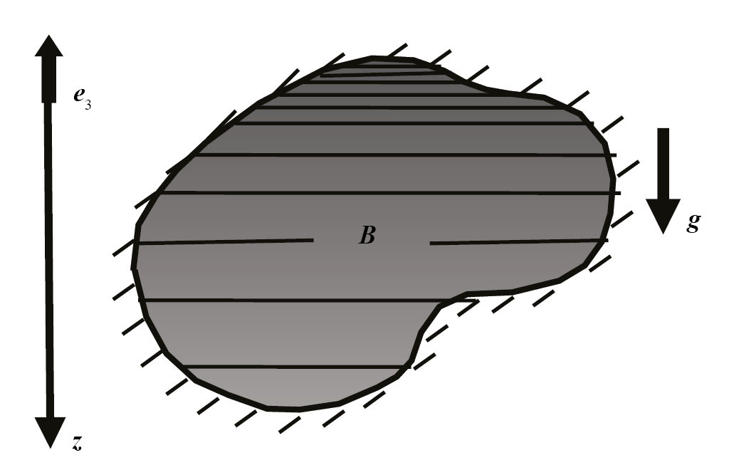 Будем исследовать уравнения движения распределенной механической системы при малых возмущениях относительно равновесного гидростатического состояния, принимаемого за отсчетное. Считается, что система в отсчетном состоянии занимает ограниченную область произвольной формы (рис. 1) с фиксированным положением материальных точек границы. Материал считается пространственно неоднородным, несжимаемым и вязкоупругим по Фойхту (2.6) с непрерывным пространственным распределением параметров модели. Имея в виду исследование в дальнейшем гравитационной неустойчивости, вызываемой уменьшением плотности с глубиной (аномальной стратификацией), в данном параграфе тоже будем учитывать наличие умеренной аномальной стратификации, не нарушающей устойчивости УСС.