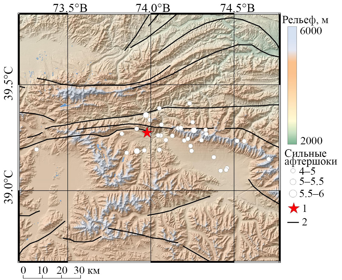 25 октября 2016 года в провинции Акетао (Китай) произошло сильное землетрясение с Mw 6.6. Эпицентр землетрясения с координатами 39.273° с. ш., 73.978° в. д. находится в районе разлома Мудзи в северо-западной части сейсмогенной зоны Конгур-Шань (рис. 1) [6]. Глубина гипоцентра составляет 10 км. 26 октября последовал сильный афтершок с М5 к юго-востоку от эпицентра главного толчка, в последующие 5 дней зарегистрированного около 386 афтершоков с магнитудами М < 5.